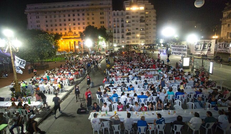 Militantes de varias organizaciones sociales peronistas y de sectores independientes con diferentes consignas, compartieron la mesa de Nochebuena, en las inmediaciones del Obelisco porteño y frente al edificio del Congreso nacional, en reclamo de trabajo digno, terminar con la pobreza y una vivienda digna para todos.