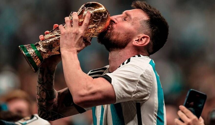 Se trata de la icónica imagen de Messi en andas con la Copa del Mundo, en plenos festejos minutos después haber derrotado por penales a Francia, tras el infartante empate 3 a 3.