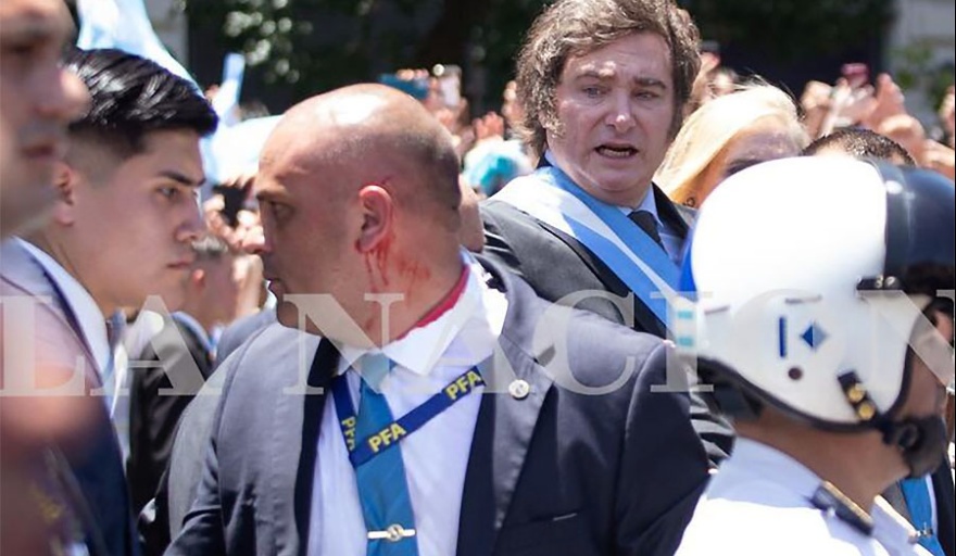 Todo cuando cuando Milei saludaba mientras circulaba a bordo de un auto descapotable y cubría el trayecto entre el Congreso y la Casa Rosada: en un momento dado un botellazo cayó desde uno de los laterales, habiendo partido en medio de la gente, y de milagro no impactó en el líder libertario, lo que aparenta ser un intento de magnicidio.