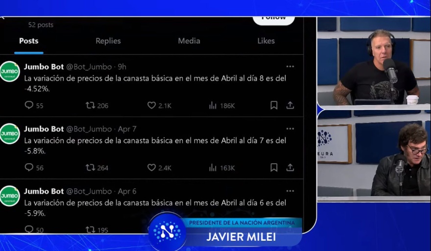 A continuación, el entrevistador Alejandro Fantino le preguntó cuál había sido la reacción de los supermercadistas y Milei sorprendió al invitar a mirar las publicaciones de la cuenta @bot_jumbo, para certificar la “caída de precios”.