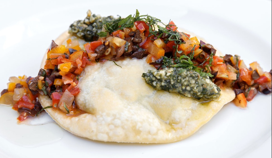 La carta propone comenzar con el gran raviolón frito con centro de yema, mucha muzzarella, pesto y olivas negras o la tortilla de papas (bien babé, como le gusta a Feibelmann).