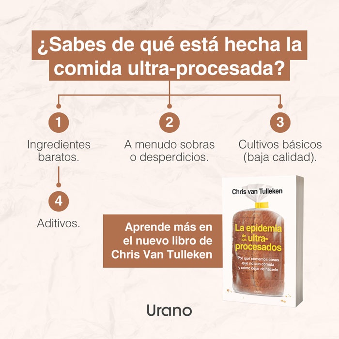 En La epidemia de los ultraprocesados, Chris van Tulleken nos ofrece una reveladora investigación que nos ayudará a entender por qué el consumo de estos alimentos está relacionado con el desarrollo de graves enfermedades, además de contribuir a la contaminación medioambiental, y qué podemos hacer para luchar contra un sistema que nos dificulta enormemente tomar decisiones más saludables.