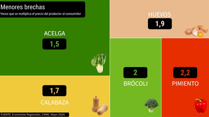 De los cinco productos que presentaron menor diferencia entre el precio que recibió el productor y el que pagó el consumidor, cuatro forman parte de la canasta frutihortícola y uno de la de origen animal.