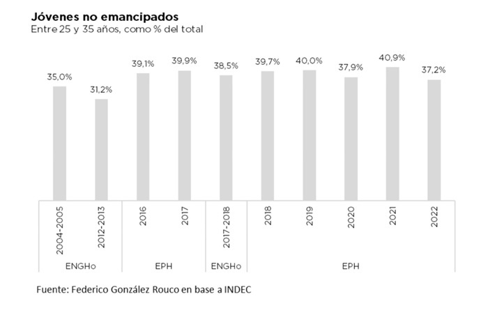 En 2016, ya a partir de la EPH que también realiza el INDEC, se registró que el 39,1% de los jóvenes vivía sin haberse podido emancipar. A partir de ahí, y tanto según EPH como según ENGHo, los jóvenes no emancipados se mantuvieron en un promedio de 39%. En 2023, último dato disponible, hubo 2,3 millones de jóvenes no emancipados, equivalente al 37% del total.