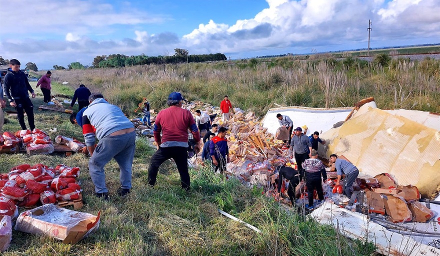 Una importante cantidad de vecinos se congregaron en la Ruta 2 para llevarse los pollos frescos que desperdigó un camión que los transportaba luego de volcar.
