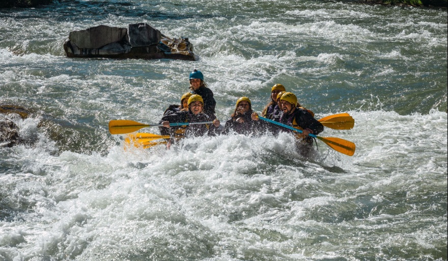 La aventura permite vivir la adrenalina practicando rafting en las turbulentas aguas del Río Mendoza partiendo del campamento base situado a orillas del embalse de Potrerillos en un circuito de 12 o 30 kilómetros con varios rápidos de clase II - III.