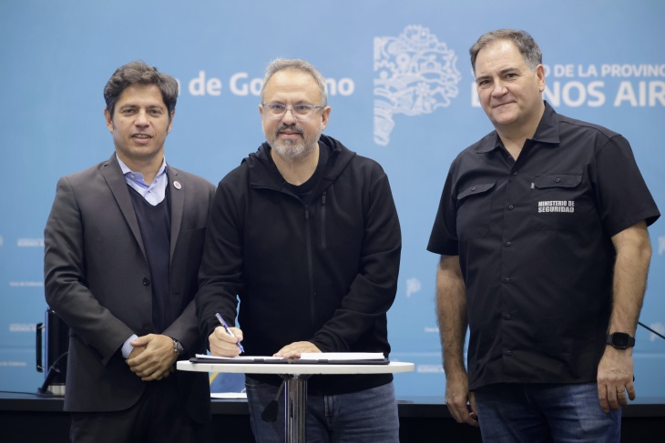 El gobernador de la provincia de Buenos Aires, Axel Kicillof, encabezó este miércoles junto al ministro de Seguridad, Javier Alonso, el acto en el que 19 intendentes bonaerenses firmaron su adhesión al Fondo de Fortalecimiento de la Seguridad.