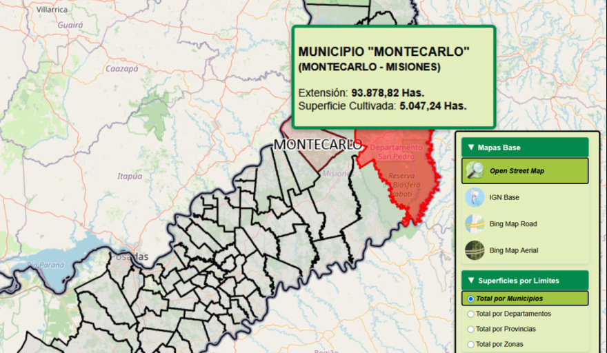 El mapa interactivo, denominado Cultivos de Yerba Mate de la República Argentina, permite visualizar por zona productora, por provincia productora (Misiones y Corrientes), por departamento y por municipio, la superficie, edad y densidad de las plantaciones, además de la cobertura arbórea nativa y/o forestación existente en los yerbales.