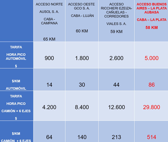 En igual tono, indicó que “claramente se trata de un ajuste recaudatorio esquilmando el bolsillo de los usuarios viales y sólo para beneficiar a la empresa AUBASA y tratar así de ir cubriendo el déficit de la misma. Automáticamente este aumento del peaje afecta el costo de transporte y por ende todos los precios de la economía”.