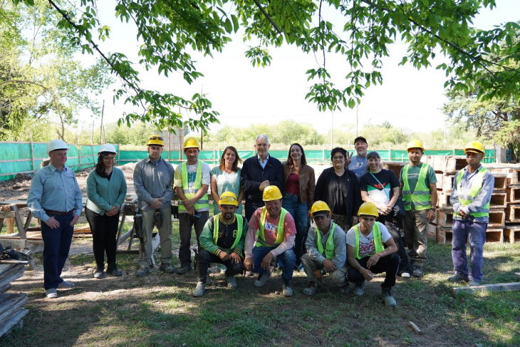 El proyecto incluye dos plantas, seis aulas, SUM, sala multimedios, espacios administrativos y una rampa de acceso, conformando un polo educativo junto al jardín y la escuela primaria. En esta etapa también se realizaron tareas de movimiento de suelo, nivelación y relleno del terreno para preparar el espacio donde se levantará el edificio.