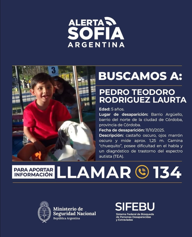 Las autoridades difundieron la imagen del pequeño Pedro y solicitaron que quien tenga información se comunique con la Policía o con la Unidad Judicial más cercana. La comunidad cordobesa se mantiene en vilo, mientras continúa la intensa búsqueda que, por estas horas, se concentra en las rutas del centro y este provincial.