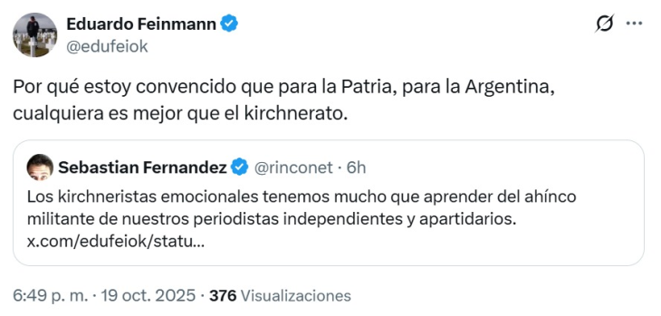El periodista Eduardo Feinmann volvió a encender la polémica en redes sociales con un nuevo mensaje cargado de tono político. En su cuenta de X (ex Twitter), escribió: