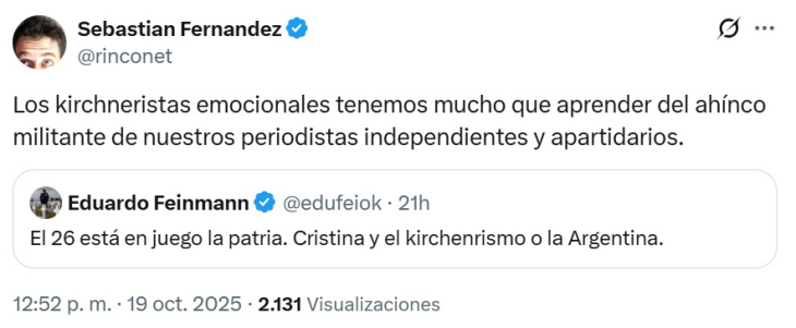 El conductor de Radio Mitre y La Nación+, reconocido por su firme crítica al kirchnerismo, suele expresar en X su mirada política sin filtros, convirtiéndose en una de las voces más activas del periodismo opositor.