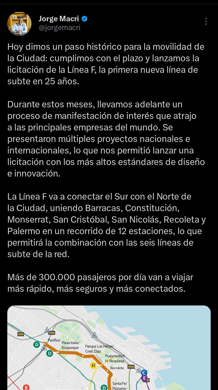 Las obras comenzarán el próximo año, tras el proceso de licitación ya abierto. Con una inversión prevista de 1.350 millones de dólares, la Línea F se perfila como la mayor obra de transporte público en más de dos décadas, y una de las más esperadas por los usuarios del subte.