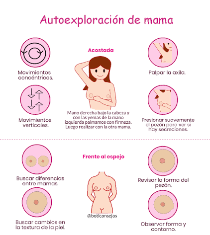 Se puede realizar frente al espejo y también acostada, palpando con las yemas de los dedos desde el centro hacia los costados. Si se nota alguna zona endurecida, retracción o secreción, es fundamental acudir al médico.