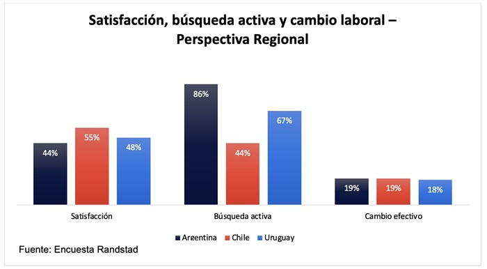 Si comparamos estos datos con los de la región, Argentina encabeza el podio, con un 86 % de trabajadores en búsqueda activa de trabajo. Luego se ubica Uruguay con el 67 % y, finalmente, Chile con el 44 %, es el país con menor deseo de cambio laboral.