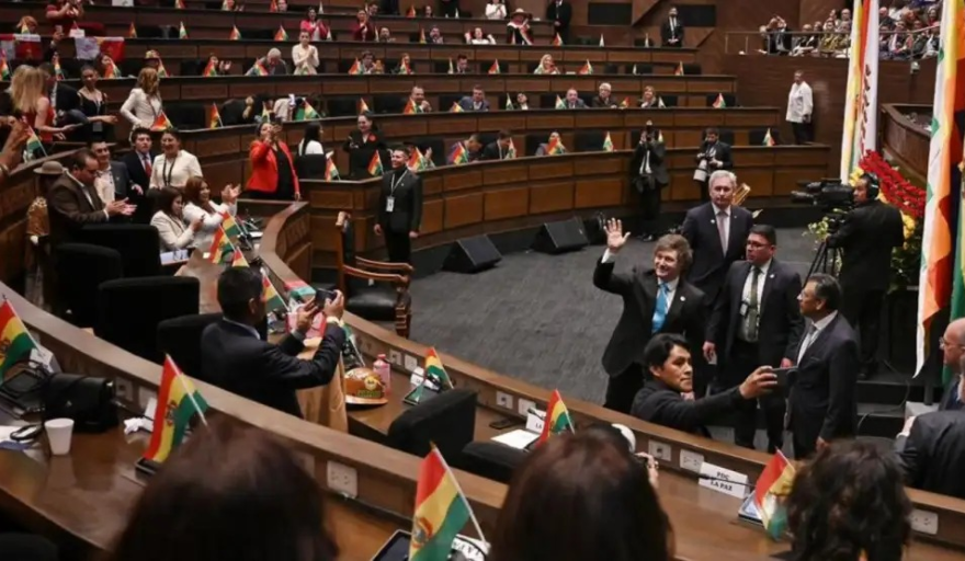 El mandatario argentino viajó junto a su hermana Karina y al canciller Pablo Quirno para asistir a la ceremonia. Fue recibido con aplausos, saludos y pedidos de selfies en la Asamblea Legislativa Plurinacional.