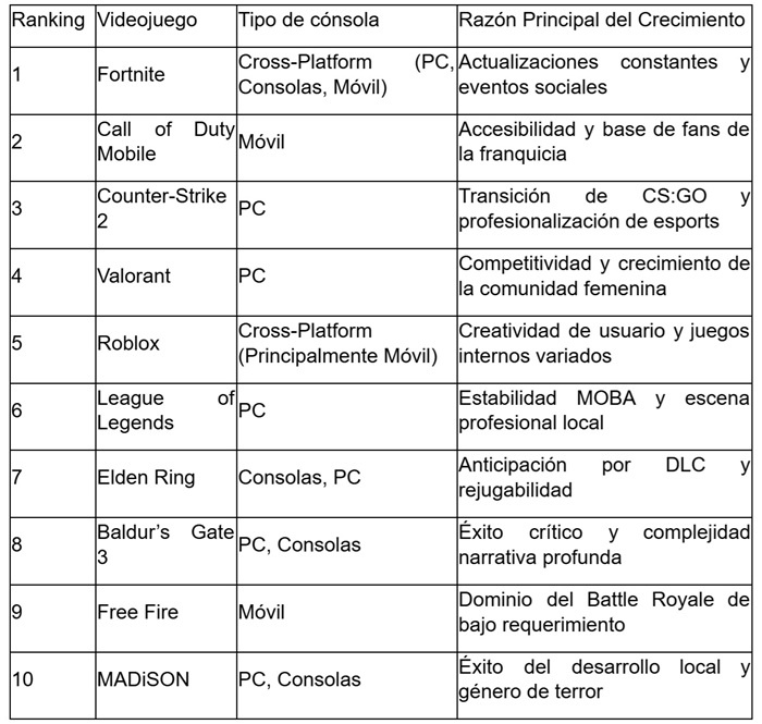 A continuación, se muestra una tabla con esa serie de videojuegos que parecieron marcar tendencia en este 2025: