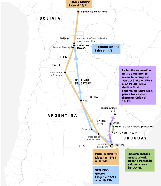 La familia, integrada por dos adultos y cuatro hijos de 21, 13, 14 y 9 años, regresaba de Bolivia tras asistir a una boda. El viaje se hizo en tres ómnibus de larga distancia, con paradas, ascensos y descensos de pasajeros en múltiples terminales. El trayecto incluyó ocho jurisdicciones antes de llegar a Colón, Entre Ríos, donde luego cruzaron a la localidad uruguaya de San Javier, donde residen.