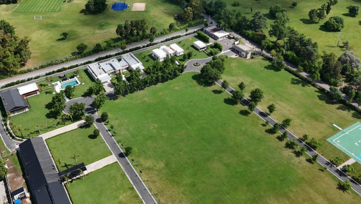 La propiedad de diez hectáreas posee más de 105 mil metros cuadrados y tiene piscina, cancha de tenis, áreas deportivas y hasta un sector acondicionado para el aterrizaje de helicópteros.