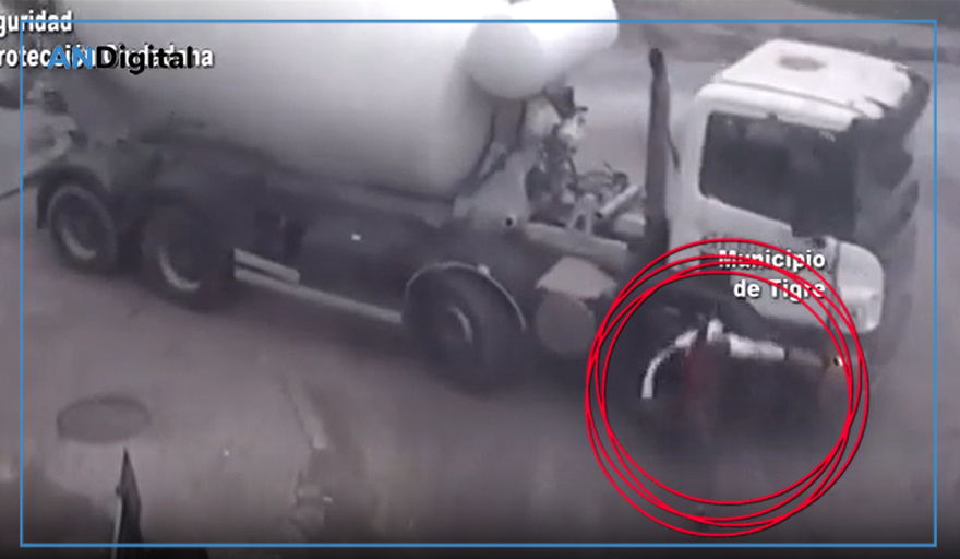 En las imágenes, aportadas por el municipio, se ve que este muchacho cruza perfectamente bien la calle, por la senda peatonal, aunque en ningún momento se percata que el camión mezclador viene doblando desde Colombia y hacia Belgrano.