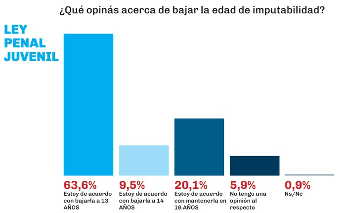 Ante el disparador de la baja en la edad de imputabilidad, el 63,6 % se mostró de acuerdo en llevarla a los 13 años, mientras que el 9,5 optó por que sea a los 14 años. En contraposición, el 20,1 % de la ciudadanía se pronunció en pos de mantenerla en 16 años y el 5,9 % no tiene opinión al respecto.