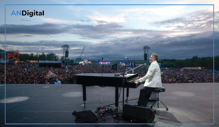 En el Escenario Norte, el rosarino desplegó una propuesta ambiciosa y profundamente artística, que lo tuvo repartido entre el piano ubicado al frente de su banda y la pasarela, en diálogo permanente con el público.