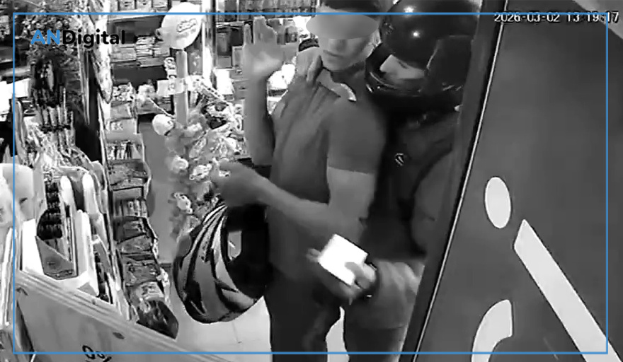 En las imágenes se observa a un joven motociclista que entra al kiosco, pide algo y mientras ingresa a su teléfono para abonar desde una aplicación, un sujeto con casco y con una cuchilla de carnicero lo aborda desde atrás, le pone el arma blanca en el cuello y lo amenaza.