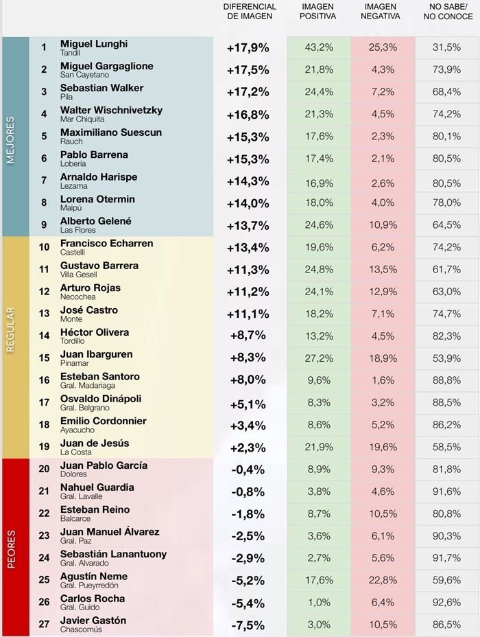 En el otro extremo del ranking se ubican los intendentes con peor diferencial de imagen en la sección. En último lugar aparece Javier Gastón (Chascomús), con un diferencial de -7,5 puntos porcentuales; seguido por Carlos Rocha (General Guido), con -5,4 puntos; y Agustín Neme (General Pueyrredón), con -5,2 puntos.