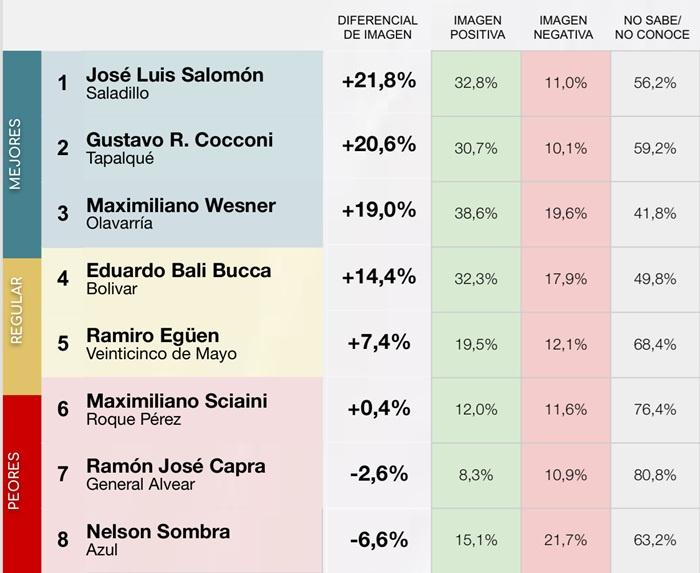 En el otro extremo del ranking se ubican los intendentes con peor diferencial de imagen en la sección. En último lugar aparece Nelson Sombra (Azul), con un diferencial de -6,6 puntos porcentuales; seguido por Ramón José Capra (General Alvear), con -2,6 puntos; y Maximiliano Sciaini (Roque Pérez), con +0,4 puntos.