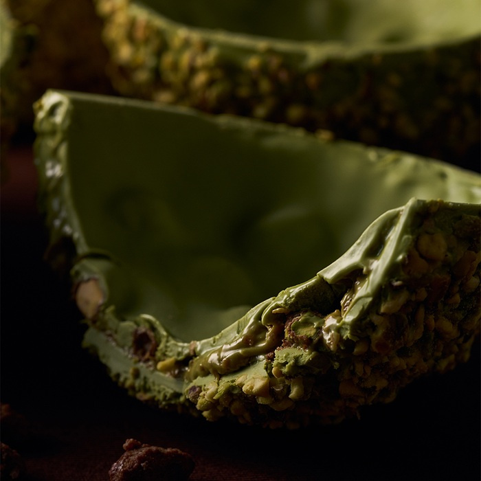 Chocolate blanco de origen belga, saborizado con pistacchio. En su interior, un relleno cremoso con pistacchios caramelizados crocantes, que aporta textura y un contraste equilibrado entre dulzura y notas tostadas.