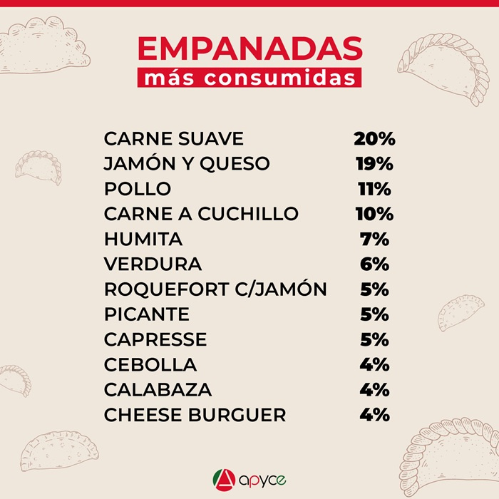 En cuanto a preferencias, los argentinos según indica APYCE tienen sus elecciones bien marcadas. Las empanadas de “carne suave” se coronan en el primer lugar del podio con un 20 % de preferencia, seguidas de cerca por las de “jamón y queso” en segundo lugar con un 19 % (una mínima diferencia).