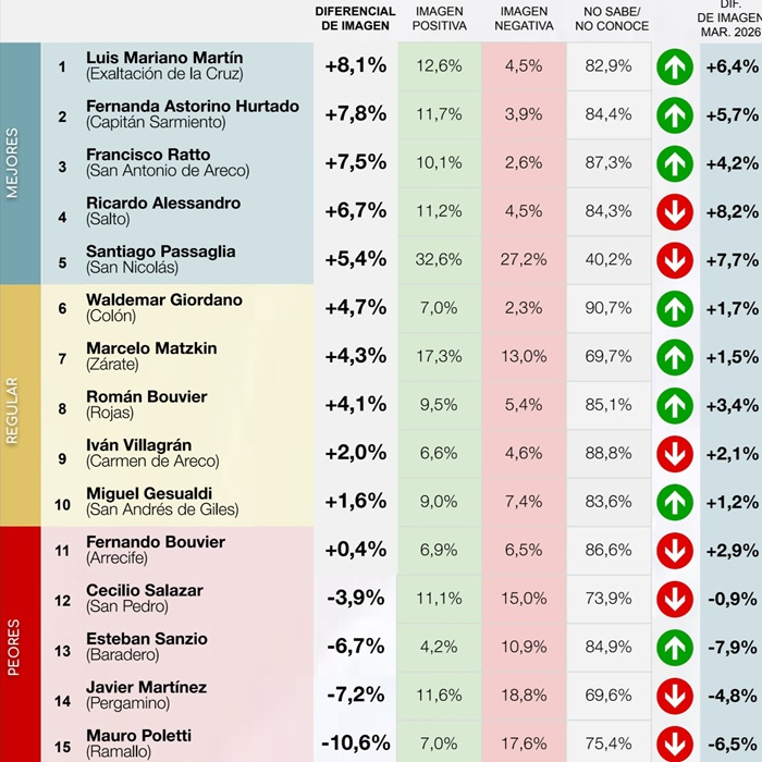 En el otro extremo del ranking, los intendentes con peor diferencial del mes son: en último lugar Mauro Poletti (Ramallo) con -10,6 %, seguido por Javier Martínez (Pergamino) con -7,2 %, y luego Esteban Sanzio (Baradero) con -6,7 %.