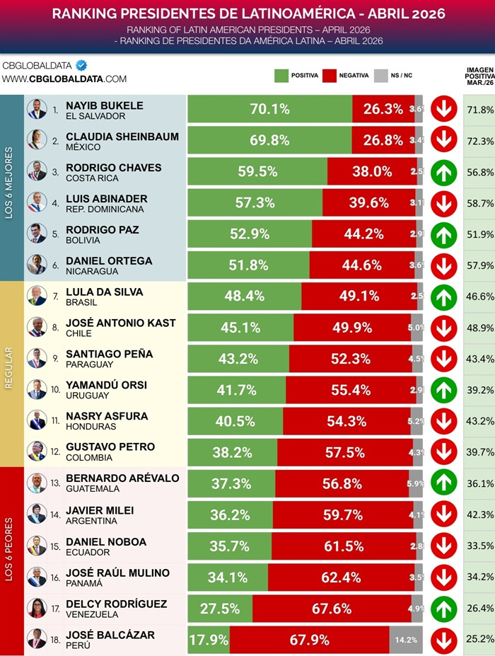 En el otro extremo del ranking, los presidentes con peor imagen pública en sus respectivos países son: José María Balcázar de Perú, quien se posiciona en el último lugar con 17,9% de imagen positiva; seguido por Delcy Rodríguez de Venezuela con 27,5%; y cierra el podio negativo José Raúl Mulino de Panamá con 34,1 % de aprobación.