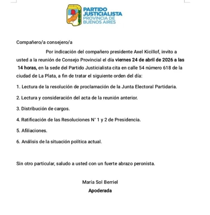 El Consejo Provincial del Partido Justicialista de la provincia de Buenos Aires sesionará este viernes 24 de abril en la sede partidaria de calle 54 N° 618 entre 7 y 8 de La Plata, marco en el que el gobernador Axel Kicillof quedará formalmente al frente de la conducción de la fuerza peronista.