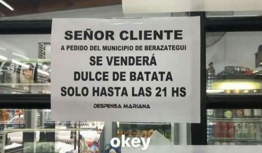 El primero de ellos y que más furor causó, fue uno que rezaba lo siguiente: “Señor cliente, a pedido del Municipio de Berazategui, se venderá dulce de batata solo hasta las 21:00”. El mensaje estaba escrito con letras negras sobre un papel blanco y estaba pegado en la puerta del negocio, pero poco se sabía realmente su origen.
