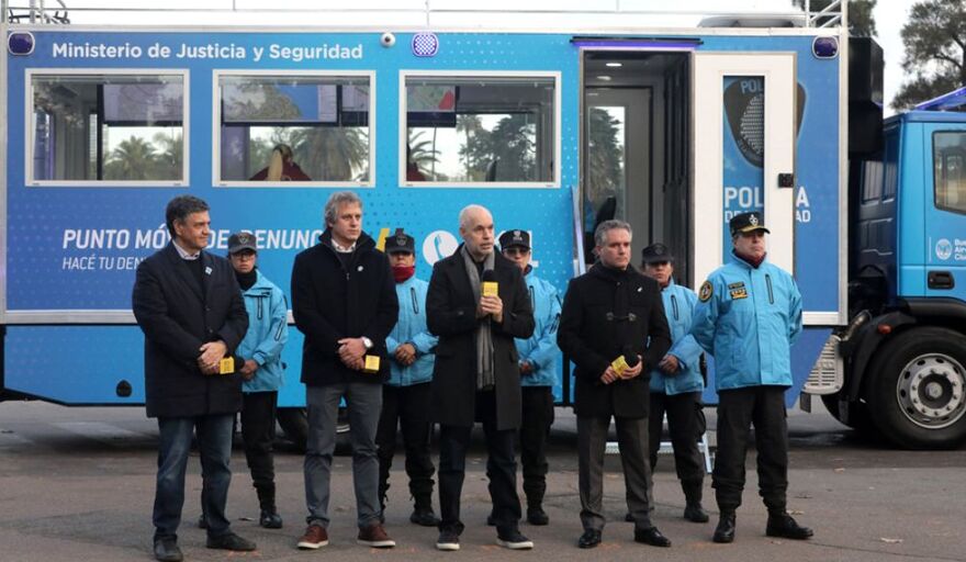 CIUDAD DE BUENOS AIRES (ANDigital) El jefe de Gobierno porteño, Horacio Rodríguez Larreta, ratificó uno de los que será eje primordial de campaña: seguridad. Fue este jueves al presentar la nueva Unidad Móvil de Monitoreo y Denuncias de la Policía de la Ciudad (UMD) que incluye todos los servicios de una comisaría, el 911 y los Centros de Monitoreo Urbano, pero sobre ruedas.