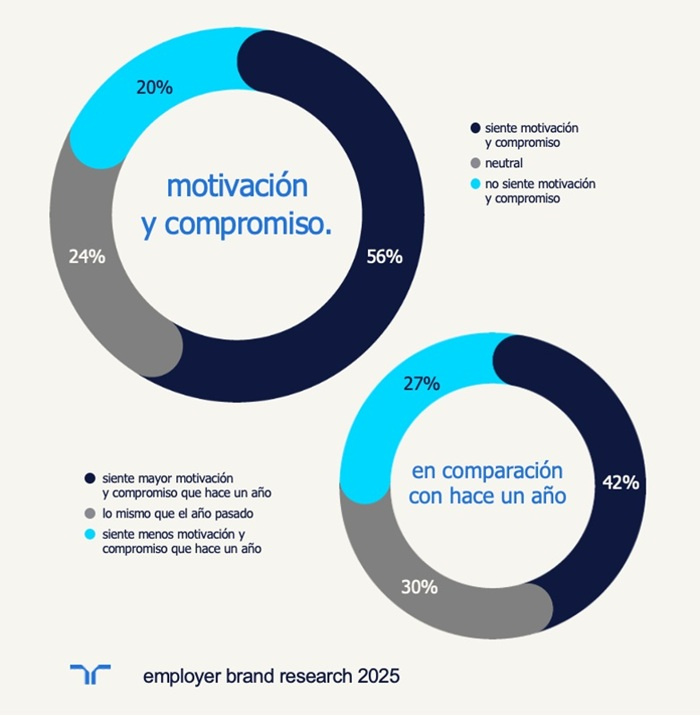 Al comparar estos resultados con los de 2024, el 42 % de los consultados en argentina afirma sentir mayor motivación y compromiso en su trabajo que hace un año. En contraposición, el 20 % indica que el nivel de compromiso y motivación con su trabajo se mantiene igual que el año pasado, y el 27 % refiere sentir menor motivación y compromiso en su empleo en comparación con 2024.