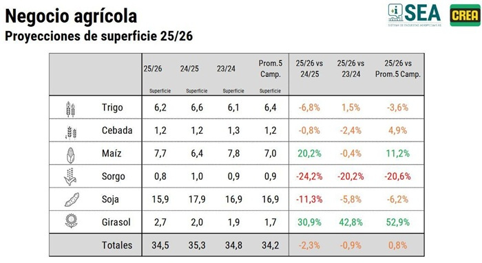 Si bien se prevé para 2025/26 una recuperación de la superficie de maíz luego de la caída del año pasado, producto de los daños ocasionados por el complejo de enfermedades transmitidas por la “chicharrita”, además de un aumento del cultivo de girasol que crecería más del 30 % en superficie, a nivel nacional el área agrícola proyectada por CREA es de 34,5 millones de hectáreas, un 2,3 % menos que en 2024/25.