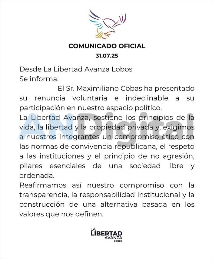 “La Libertad Libertad Avanza sostiene los principios de la vida, la libertad y la propiedad privada y exigimos a nuestros integrantes un compromiso ético con las normas de convivencia republicana, el respeto a las instituciones y el principio de no agresión”, expresaron desde LLA Lobos en un comunicado.
