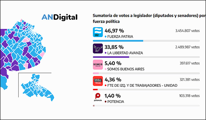 Con más de 13 puntos de diferencia en toda la provincia de Buenos Aires, Fuerza Patria no solo es el espacio que cosechó más votos, sino el que más bancas obtuvo.