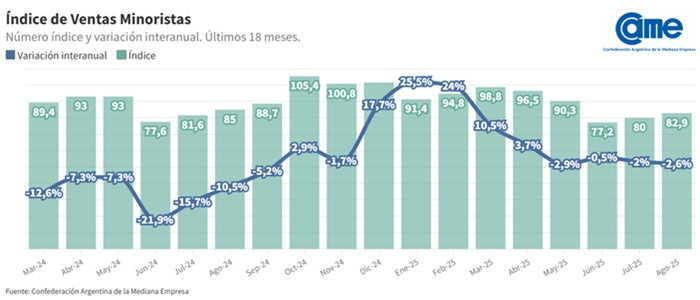 En agosto, las ventas minoristas de las PyMEs marcaron un retroceso en la medición interanual con una baja del 2,6 % a precios constantes. Comparado con el mes anterior, el descenso fue del 2,2 por ciento.
