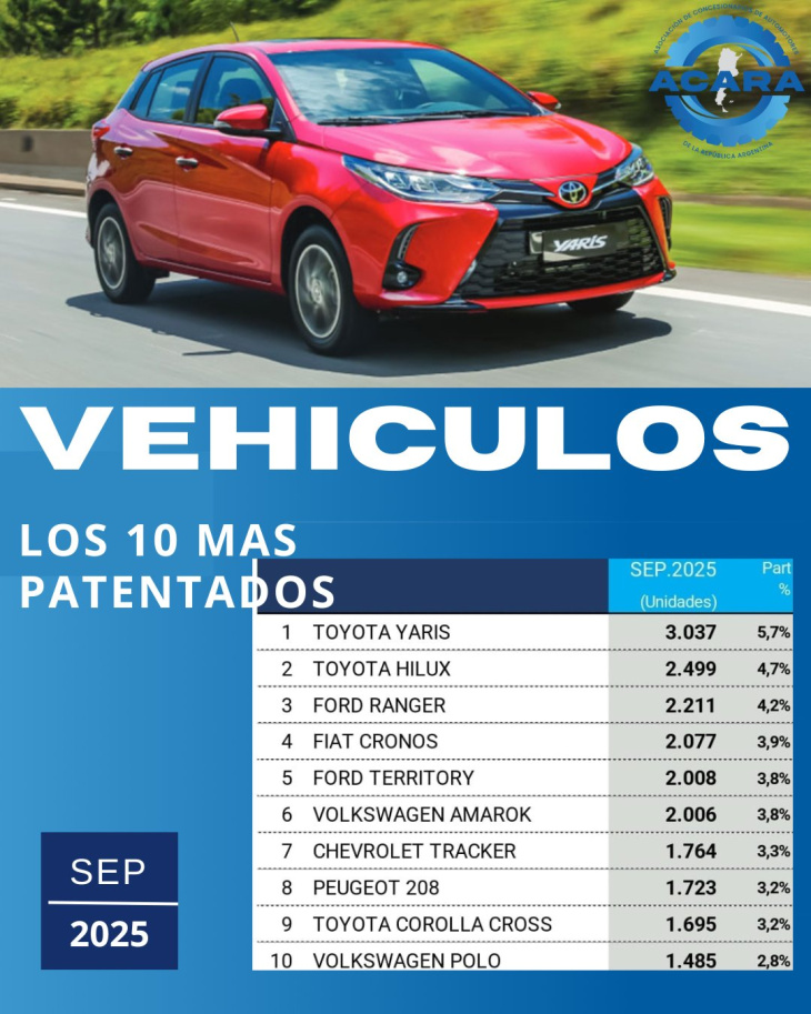 La Asociación de Concesionarios de Automotores de la República Argentina (ACARA) informó que el número de vehículos patentados durante septiembre de 2025 ascendió a 55.827 unidades, lo que representó un crecimiento del 27,8% interanual, ya que en septiembre de 2024 se habían registrado 43.679 unidades.