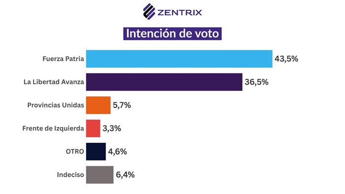 En lo que hace a la intención de voto de cara a las elecciones legislativas del próximo 26 de octubre, el sondeo muestra un crecimiento significativo de Fuerza Patria, que alcanza el 43,5 %, es decir un crecimiento de 2 puntos respecto a la medición de septiembre. Por su parte, La Libertad Avanza sube al 36,5 %, frente al 35,4 % previo.