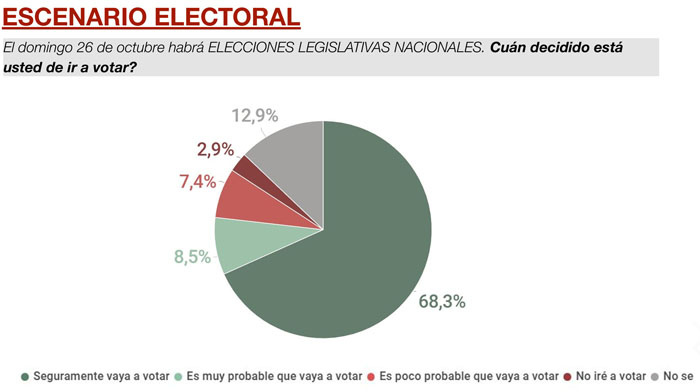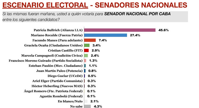 Con un escenario que se encamina a orillar el 70 % de participación electoral, la principal postulante oficialista a senadora nacional por el distrito porteño, Patricia Bullrich, alcanza según el sondeo de CB Consultora el 45,6 % de intención de voto, superando al 27,4 % del aspirante de Fuerza Patria, Mariano Recalde.