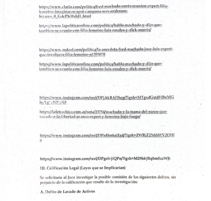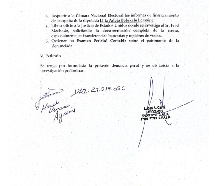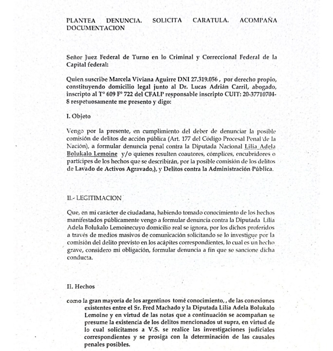 La denunciante, identificada como Marcela Viviana Aguirre, realizó la presentación acompañada por el abogado Lucas Adrián Carril, solicitando que se investigue el presunto vínculo económico y político entre Lemoine y Machado, quien habría tenido contactos con referentes de La Libertad Avanza.