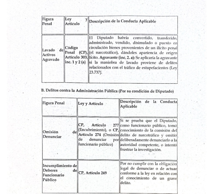 En el texto, Aguirre sostiene que “como la gran mayoría de los argentinos”, tomó conocimiento de estas conexiones a través de publicaciones periodísticas y declaraciones públicas. En ese marco, afirmó que su deber como ciudadana es denunciar la posible comisión de delitos de acción pública, entre ellos lavado de dinero proveniente del narcotráfico y delitos contra la Administración Pública.