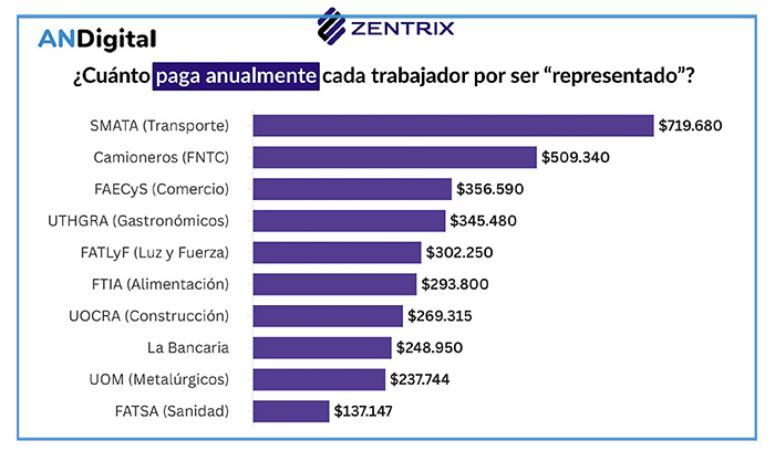 El dato surge del estudio de investigación “El poder sindical en Argentina: estructura, financiamiento y límites a la libertad del trabajador”, realizado por el equipo de Zentrix Consultora, que expone la magnitud del financiamiento sindical “compulsivo” y revela un “esquema de alta concentración, escasa transparencia y conducciones que se sostienen durante décadas gracias a este flujo permanente de recursos”.