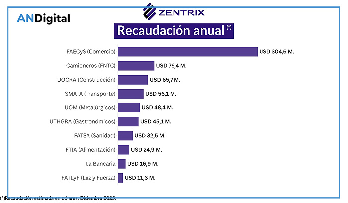 El informe también desagrega el peso financiero de cada gremio, revelando cifras que por sí solas describen la magnitud del sistema. Comercio encabeza la recaudación con más de US$ 304,6 millones anuales, seguido por camioneros US$ 79,5 millones, construcción con US$ 65,7 millones, SMATA con US$ 56,1 millones, Sanidad con US$ 32,6 millones, metalúrgicos con US$ 48,3 millones, gastronómicos US$ 45,1 millones, alimentación US$ 24,9 millones, La Bancaria con US$ 16,9 millones, y Luz y Fuerza con US$ 11,3 millones.