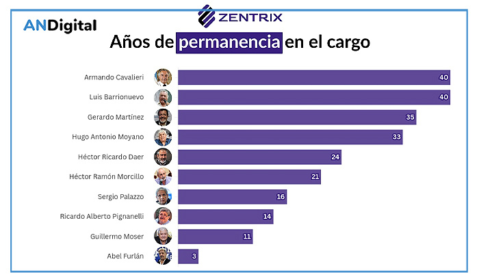 En La Bancaria, Sergio Palazzo supera los quince años de liderazgo. En UOM, Abel Furlán continúa una tradición de conducciones prolongadas dentro de la metalurgia (el secretario anterior, Antonio Calo, estuvo 18 años, y su predecesor, Lorenzo Miguel, 32 años). En Gastronómicos (UTHGRA), Luis Barrionuevo mantiene más de tres décadas al frente del gremio. En conjunto, los diez sindicatos analizados administran fondos anuales equivalentes a 0,11% del PBI, bajo estructuras internas centralizadas, con mínima competencia electoral y escaso control sobre la gestión de esos recursos.